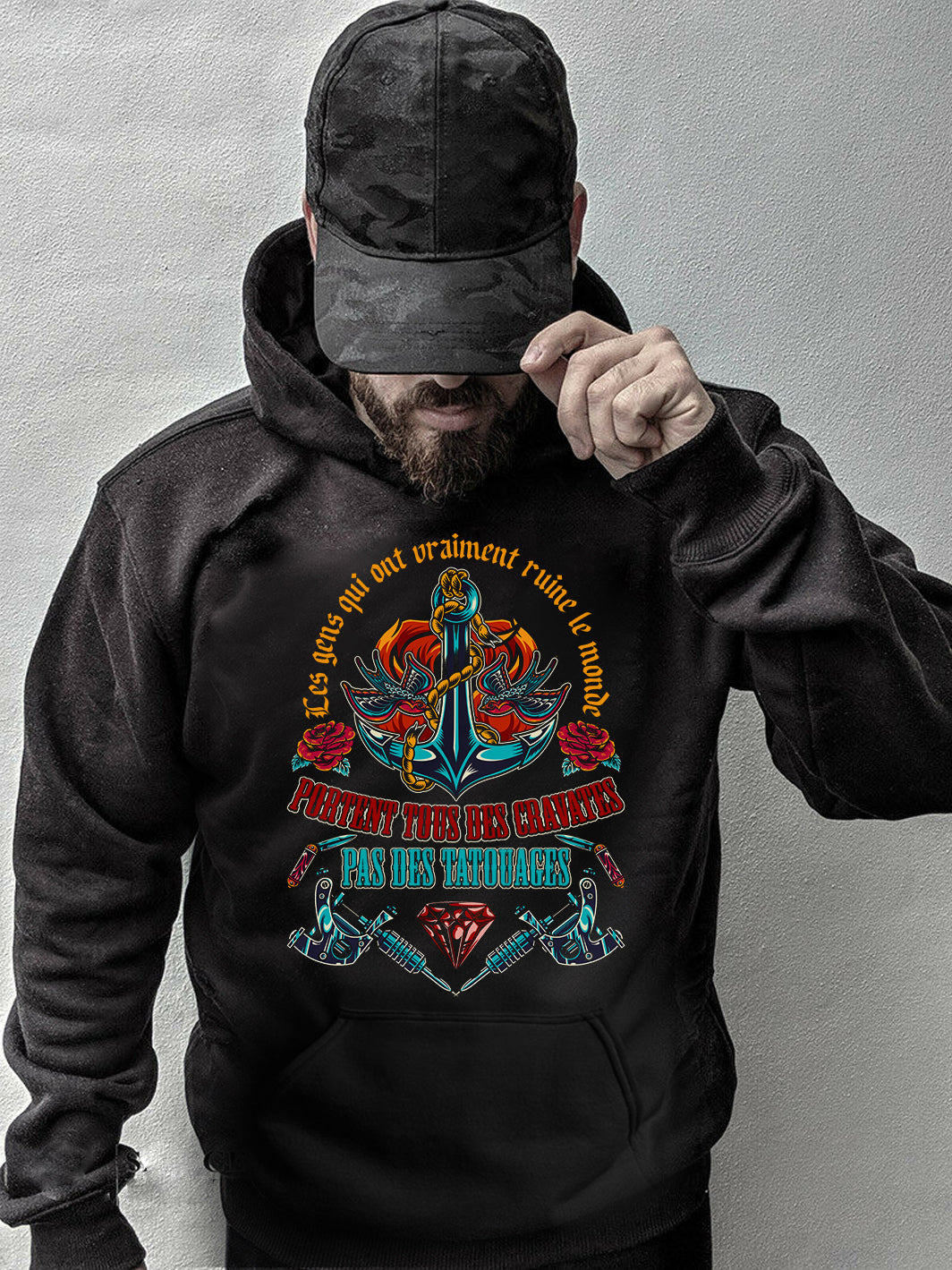 Sa coupe moderne s'adapte parfaitement à votre silhouette, tandis que les motifs uniques inspirés de l'univers des tatouages vous permettent de vous démarquer. Conçu pour une utilisation quotidienne, il est également résistant et durable, vous accompagnant dans toutes vos aventures.
