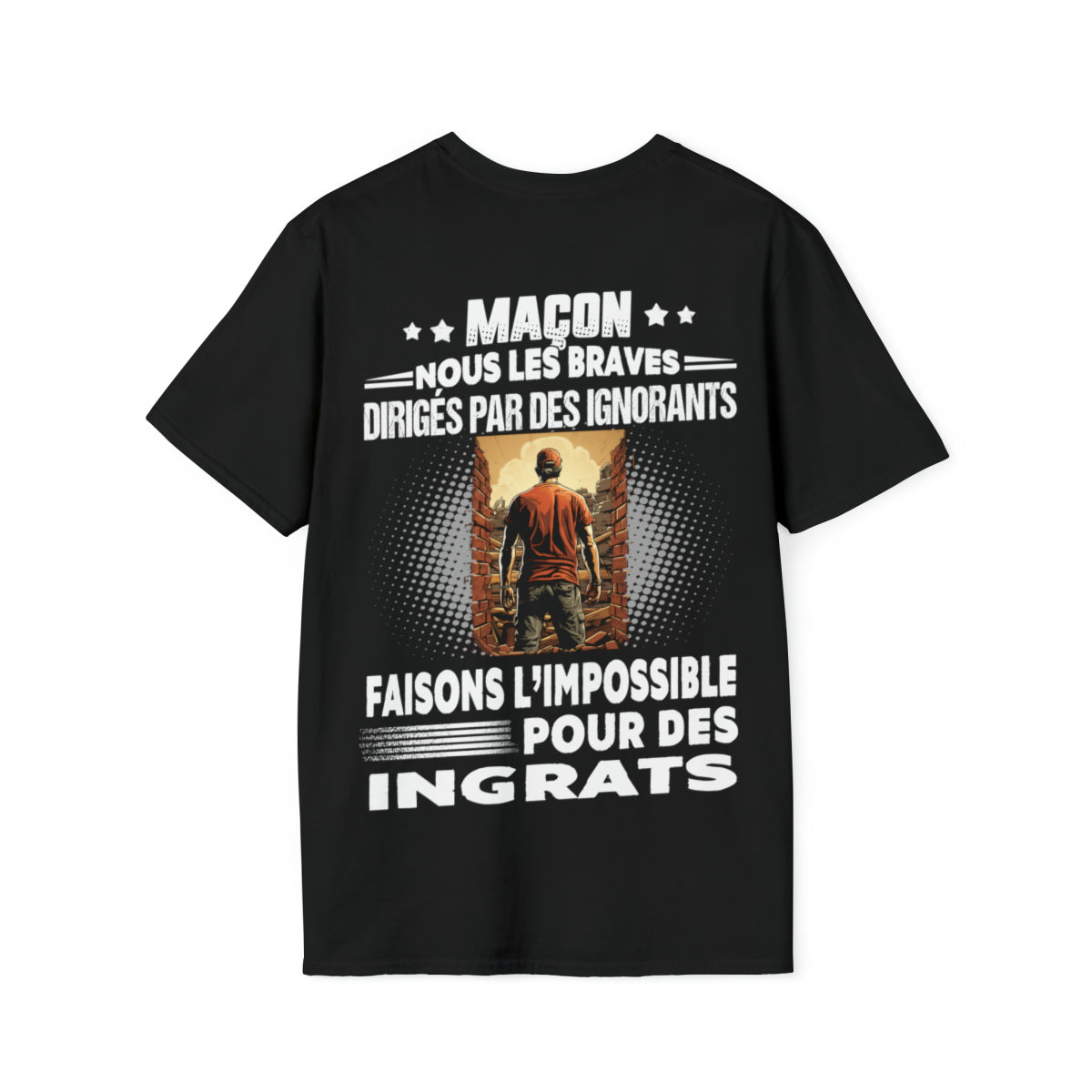 Affichez votre fierté au travail avec ce t-shirt de maçon amusant et accrocheur ! Ce t-shirt confortable de haute qualité arbore le message « Maçon, les braves dirigés par des ignorants font l'impossible pour des ingrats. » dans une police audacieuse et moderne. C'est la manière parfaite d'exprimer votre amour pour votre métier et votre engagement envers le dur labeur.
