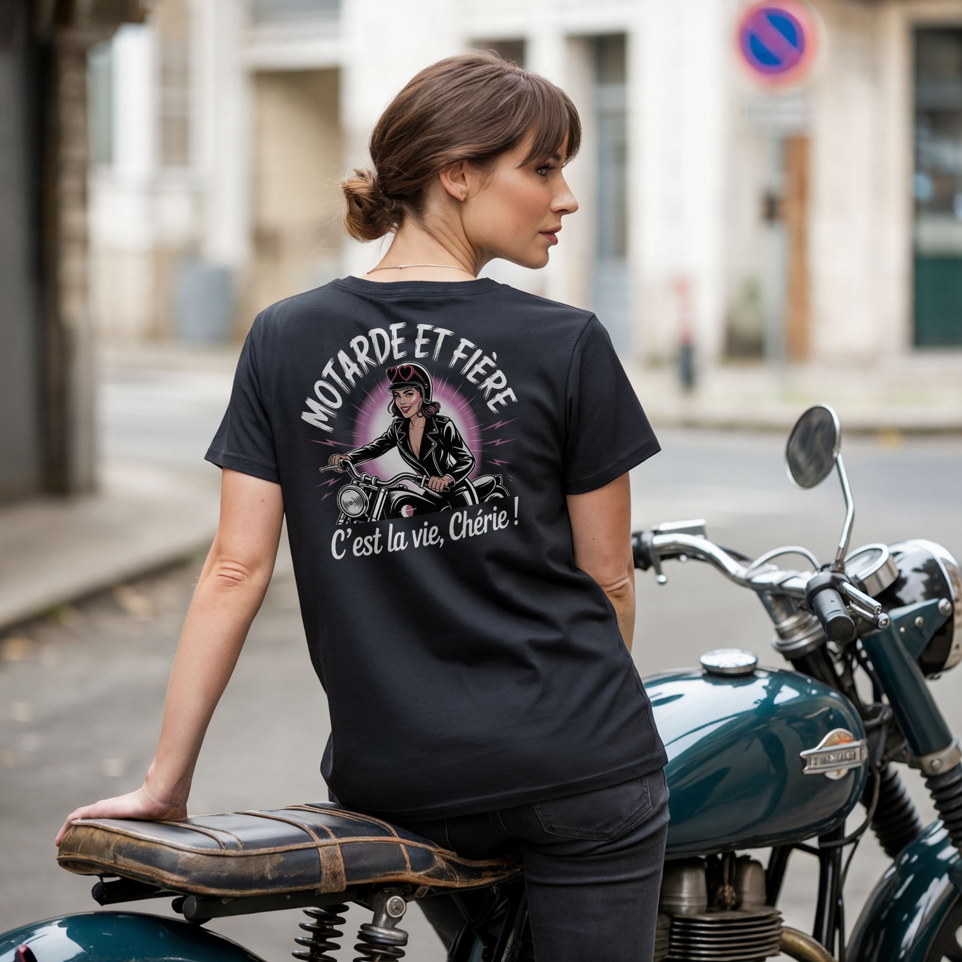 Découvrez notre t-shirt exclusif pour motardes, conçu pour les femmes audacieuses et passionnées de moto. Alliant confort et style, ce t-shirt épouse parfaitement votre silhouette tout en vous offrant une liberté de mouvement optimale. Fabriqué en matière douce, durable et respirante, il est idéal pour vos balades sur route ou vos sorties en ville.