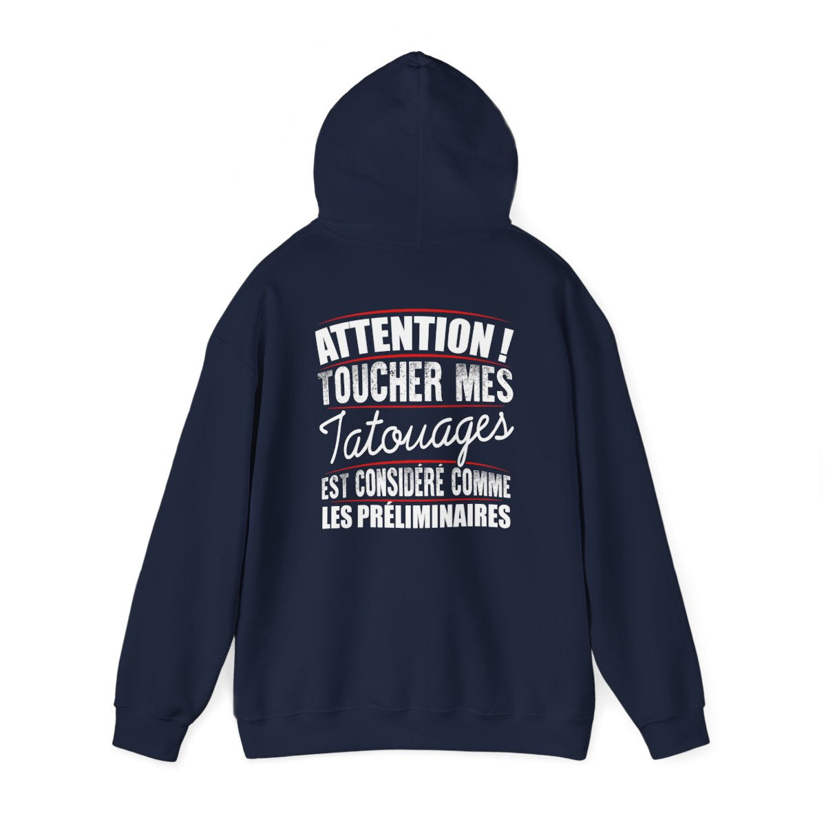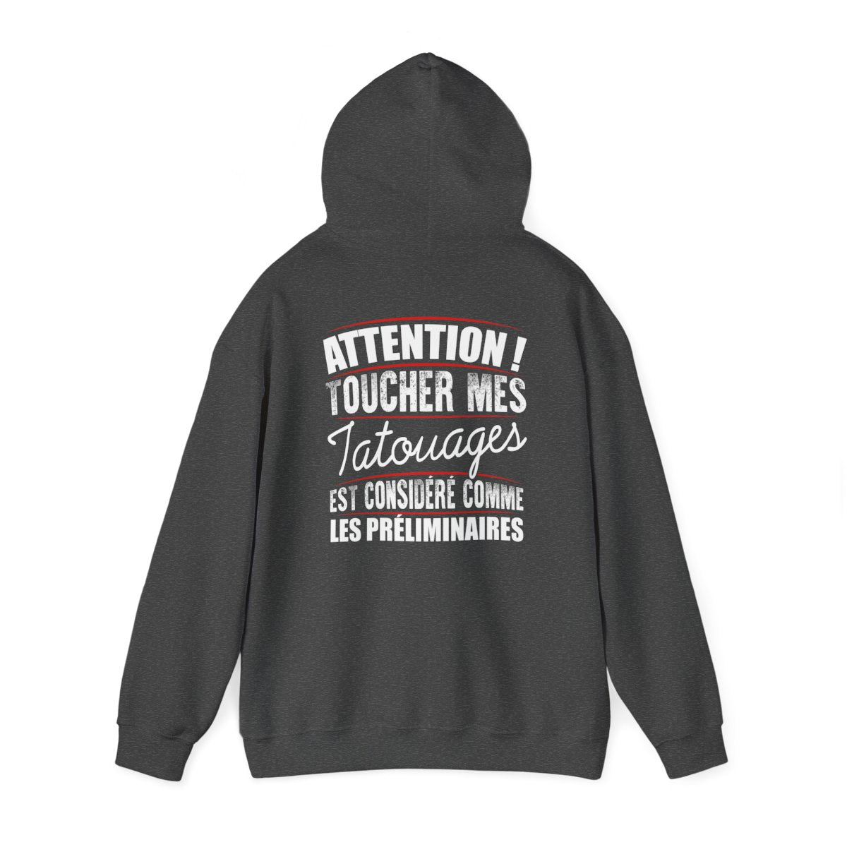 Exprimez votre fierté avec notre T-shirt et hoodie exclusifs. Imprimé avec le message audacieux "Attention! Toucher mes tatouages est considéré comme les préliminaires", chaque pièce célèbre votre individualité. Fabriqués avec soin pour un confort optimal, nos vêtements sont parfaits pour les hommes tatoués qui affirment leur style avec assurance.