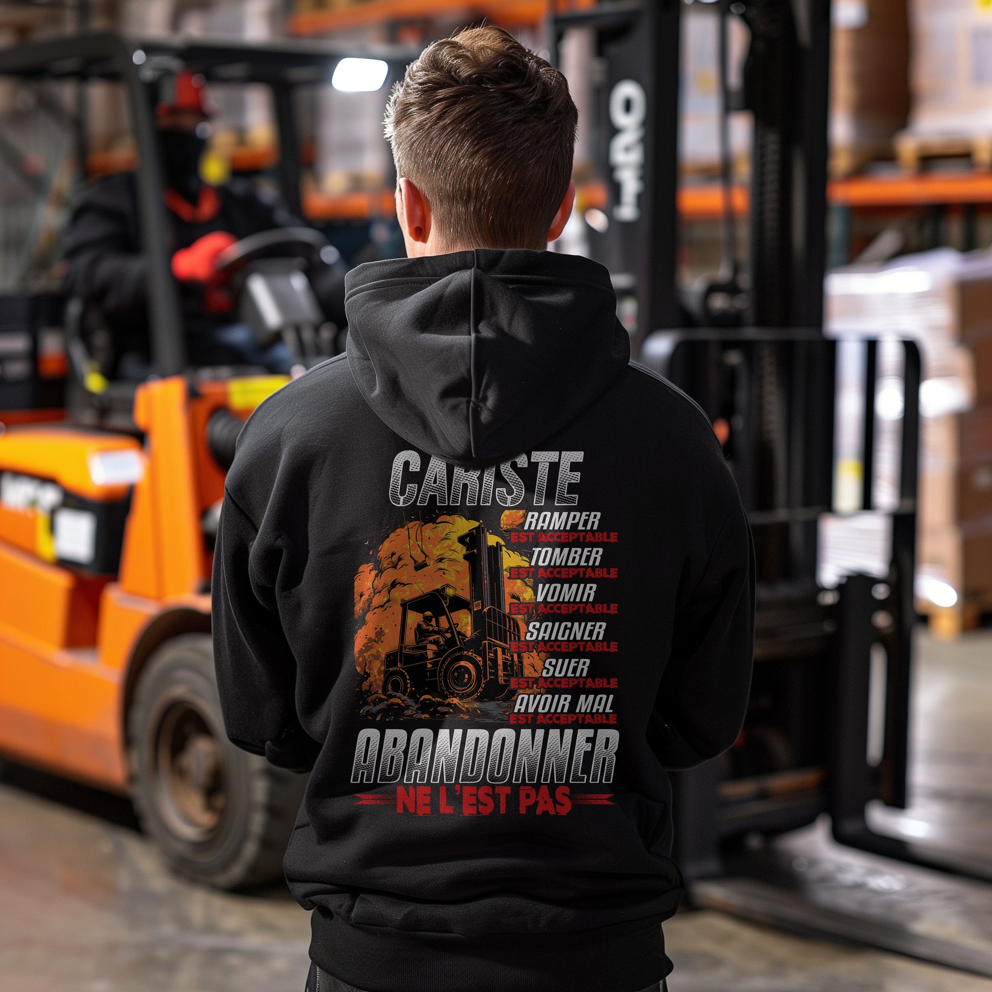 Découvrez notre collection exclusive de t-shirts conçus spécialement pour les caristes! Chaque pièce de notre collection célèbre la fierté et la passion qui animent les professionnels de la manutention. Cariste, ramper, tomber, vomir, saigner, suer, avoir mal est acceptable, abandonner ne l'est pas. Ces t-shirts sont l'expression parfaite de votre identité professionnelle, combinant confort et style pour vous accompagner au quotidien.
