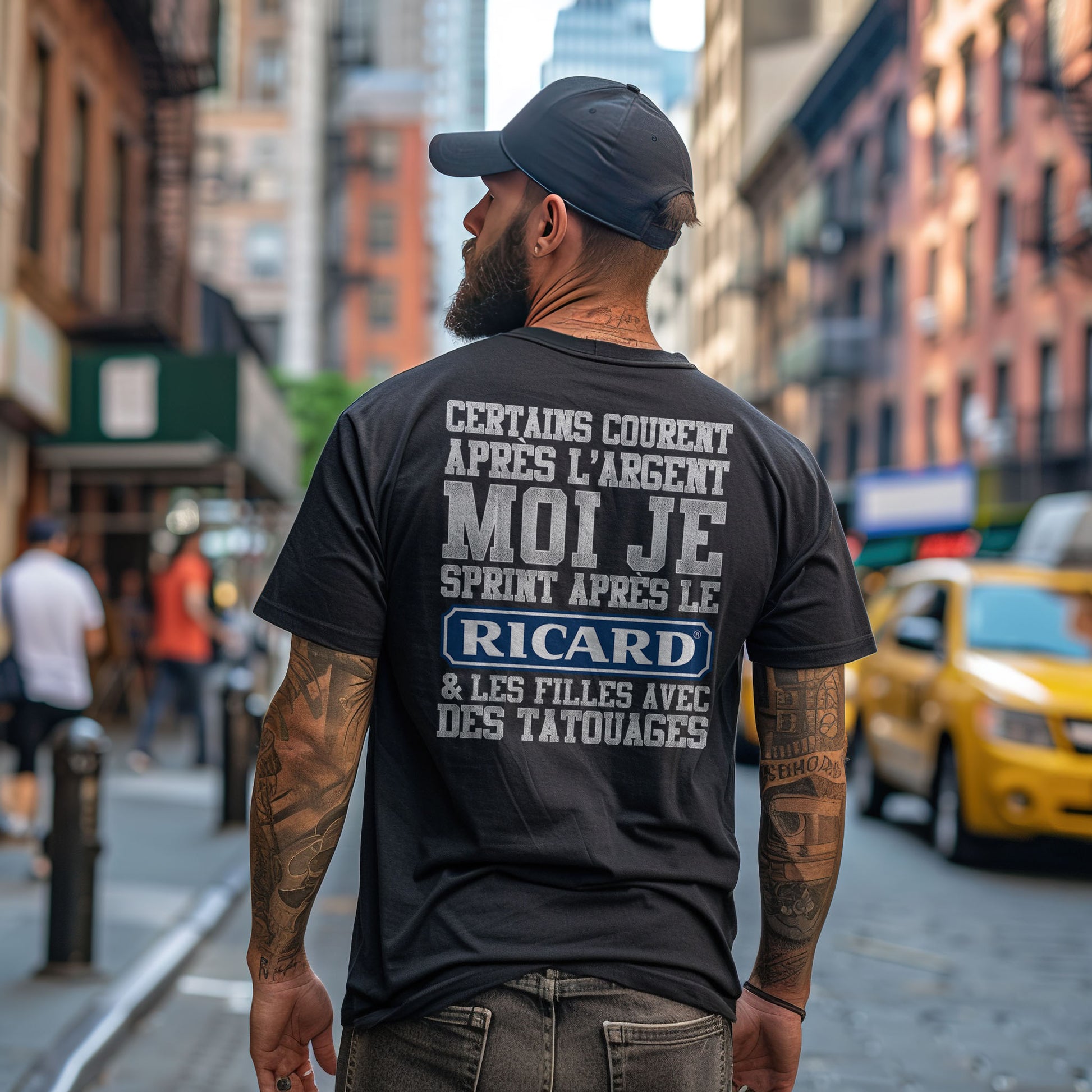 Exprimez votre fierté avec notre T-shirt et hoodie exclusifs. Imprimé avec le message audacieux "Certains courent après l'argent, moi je sprint après le ricard & les filles avec des tatouages", chaque pièce célèbre votre individualité. Fabriqués avec soin pour un confort optimal, nos vêtements sont parfaits pour les hommes tatoués qui affirment leur style avec assurance.