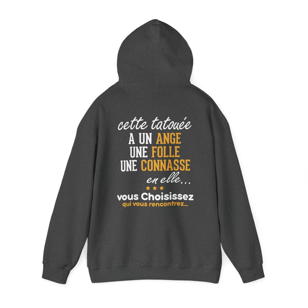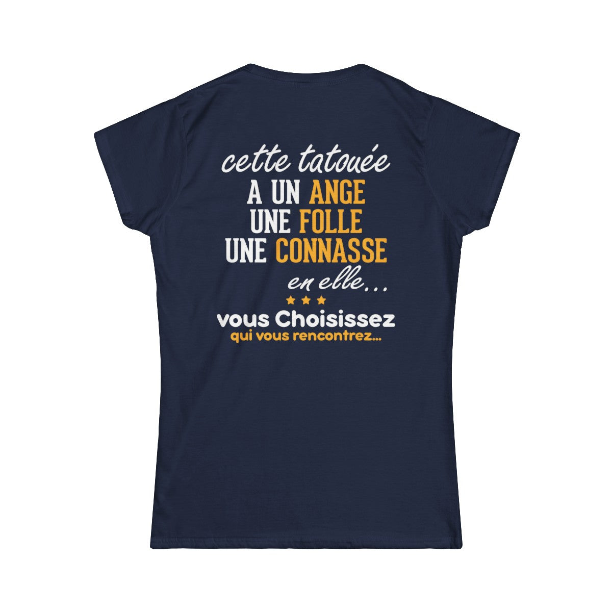 Affirmez votre fierté tatouée avec notre t-shirt exclusif arborant le message "Cette tatouée a un ange une folle une connasse en elle, vous choisissez qui vous rencontrez". Conçu pour les femmes qui célèbrent leur individualité, ce t-shirt allie confort et style, vous permettant d'afficher votre amour pour l'art corporel avec audace. Fabriqué avec des matériaux de qualité supérieure, ce t-shirt vous offre un ajustement parfait tout en mettant en valeur votre personnalité unique.