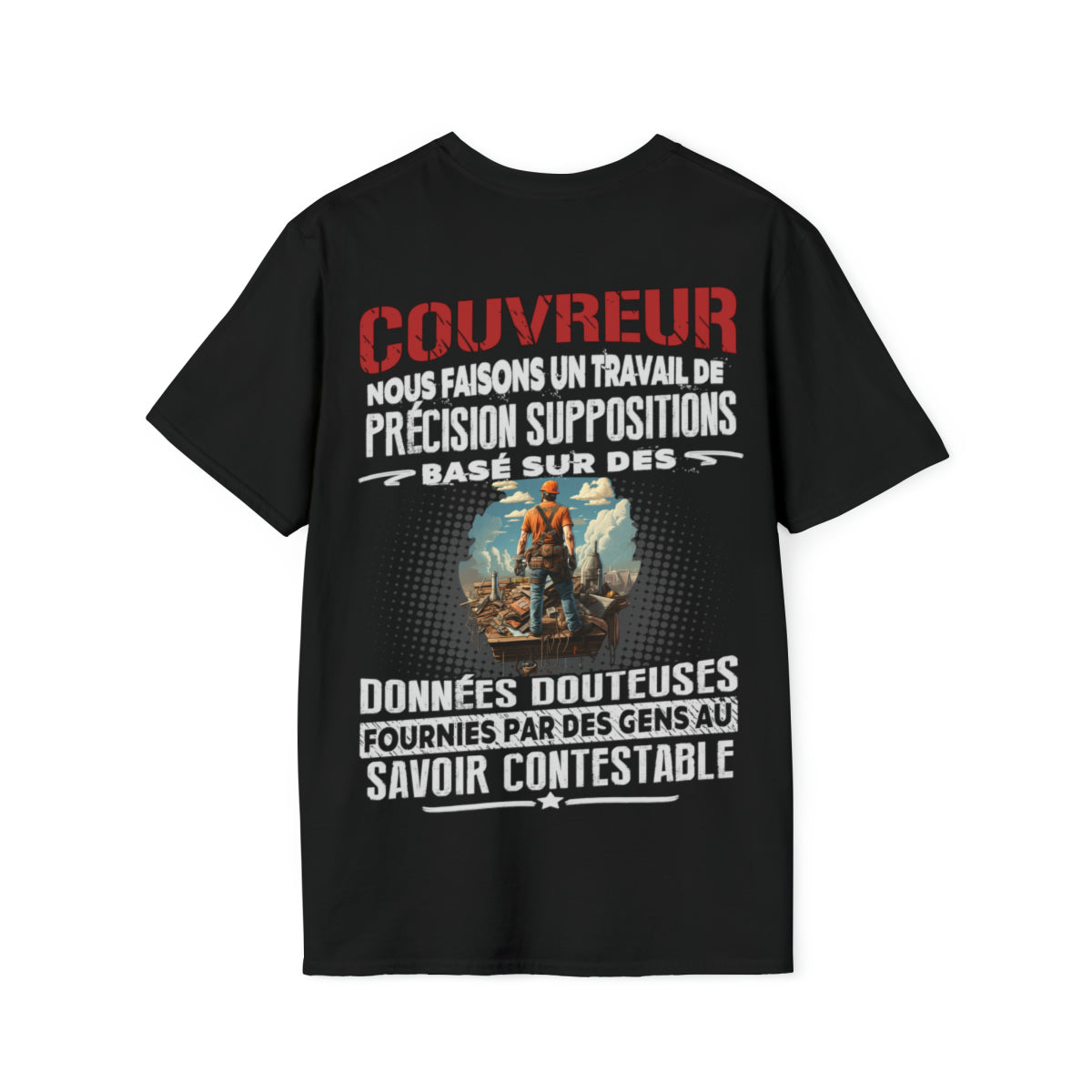 Ce t-shirt arbore le message audacieux "Couvreur, nous faisons un travail de précision basé sur des données douteuses fournies par des gens au savoir contestable.", parfait pour tout couvreur passionné par son métier. Que vous posiez des bardeaux, répariez des gouttières ou installiez des puits de lumière, ce t-shirt est le moyen parfait d'exprimer votre fierté d'être couvreur.