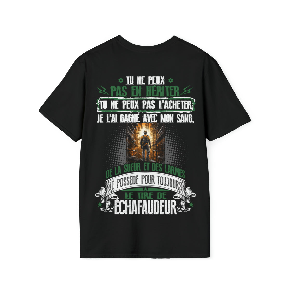 Ce t-shirt arbore le message audacieux "Tu ne peux pas en hériter, tu ne peux pas l'acheter. Je l'ai gagné avec mon sang, de la sueur et des larmes. Je possède pour toujours le titre de Échafaudeur.", parfait pour tout échafaudeur passionné par son métier. Que vous construisiez des échafaudages pour des projets de construction, des travaux de maintenance ou des événements spéciaux, ce t-shirt est le moyen parfait d'exprimer votre fierté d'être échafaudeur.