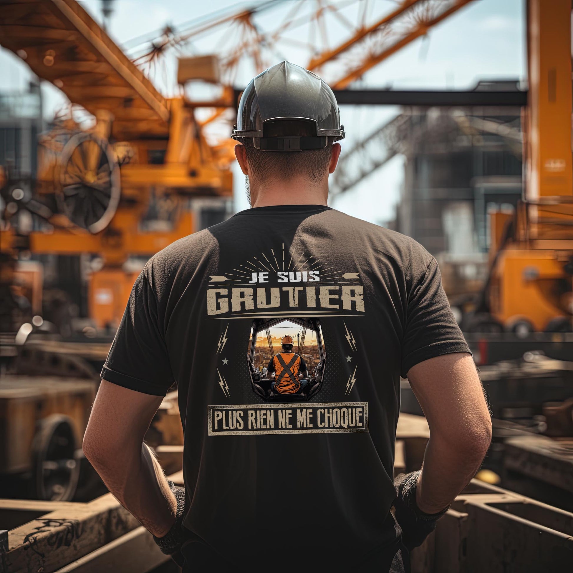 Le message sur le t-shirt est simple mais efficace : "Je suis Grutier plus rien ne me choque". C'est un excellent moyen de montrer votre amour pour votre profession et de faire savoir aux autres que vous êtes confiant dans vos compétences.