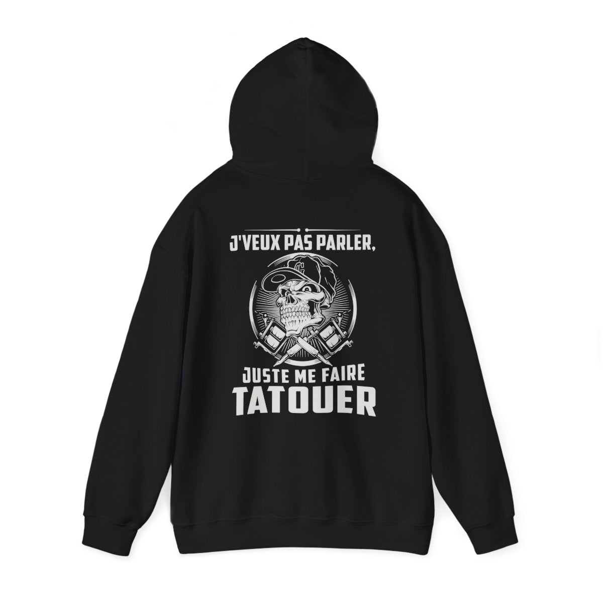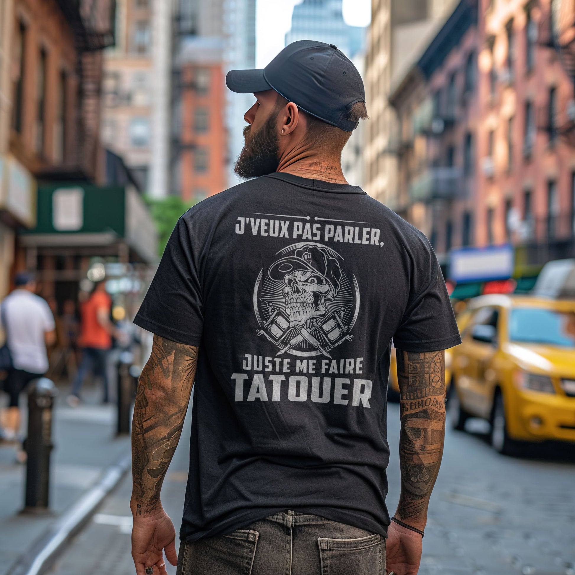 Exprimez votre fierté avec notre T-shirt et hoodie exclusifs. Imprimé avec le message audacieux "J'veux pas parler, juste me faire tatouer", chaque pièce célèbre votre individualité. Fabriqués avec soin pour un confort optimal, nos vêtements sont parfaits pour les hommes tatoués qui affirment leur style avec assurance.
