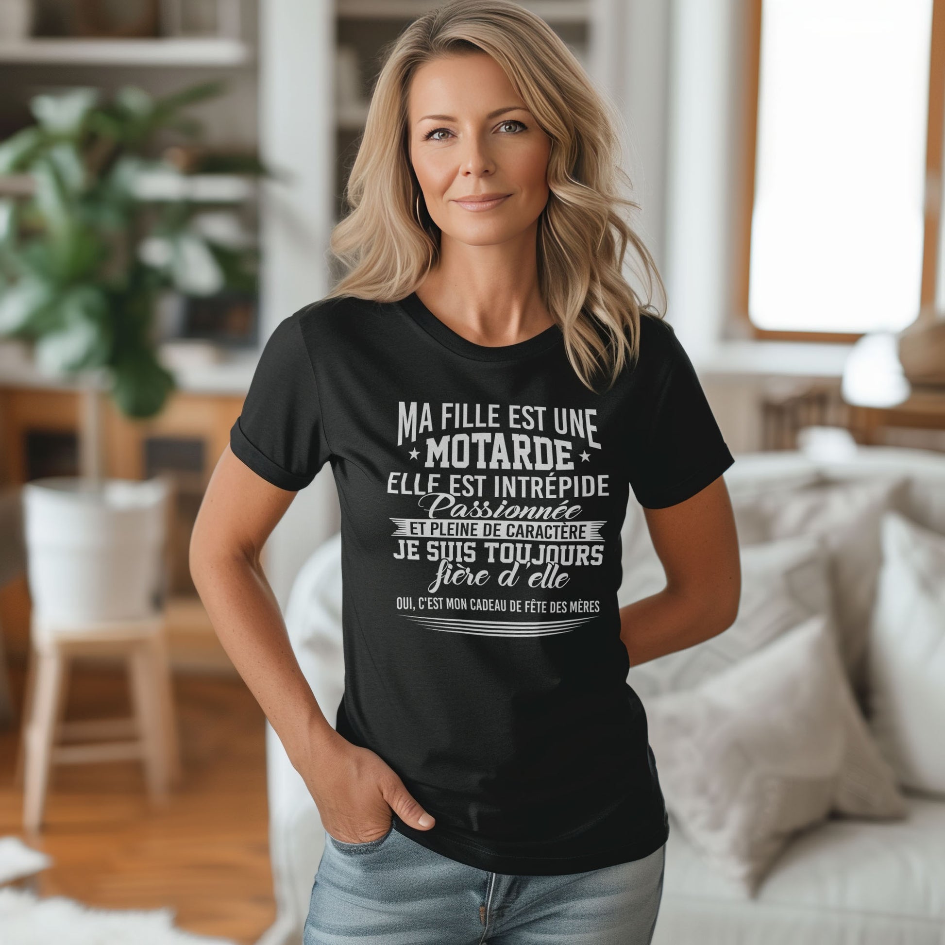 Exprimez votre fierté maternelle avec ce t-shirt exclusif ! Imprimé avec amour, il incarne la passion pour la moto de votre fille. Arborez-le avec fierté et montrez au monde entier que votre cœur bat au rythme des moteurs. Un cadeau parfait pour la fête des mères, affirmant haut et fort : 'Ma fille est motarde et je suis fier d'elle.' Un hommage à la force et à la détermination qui animent votre famille.