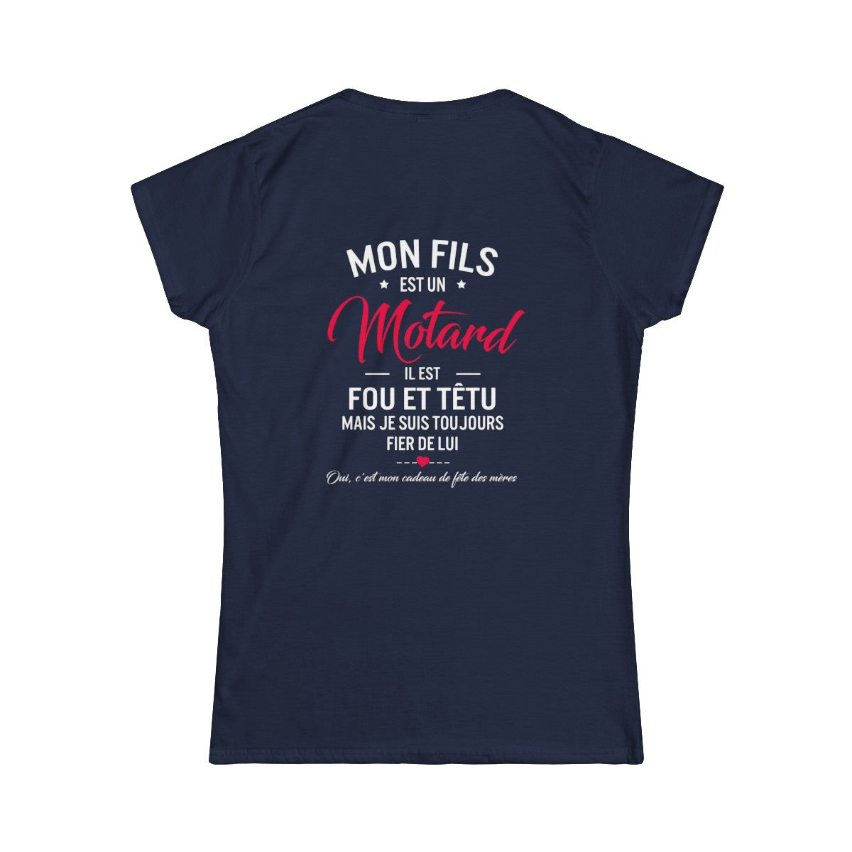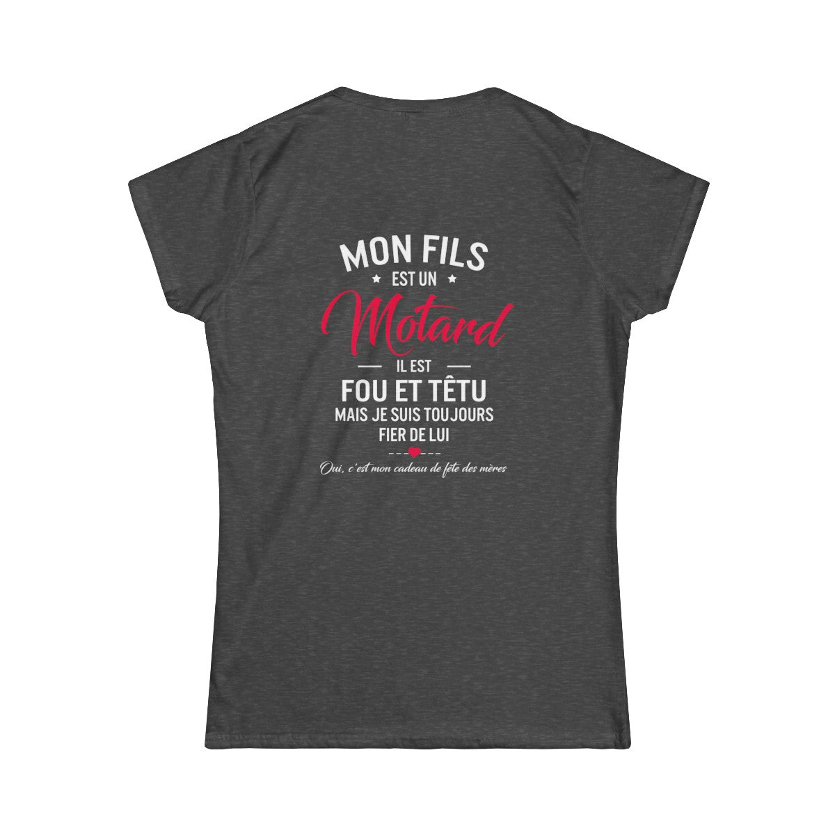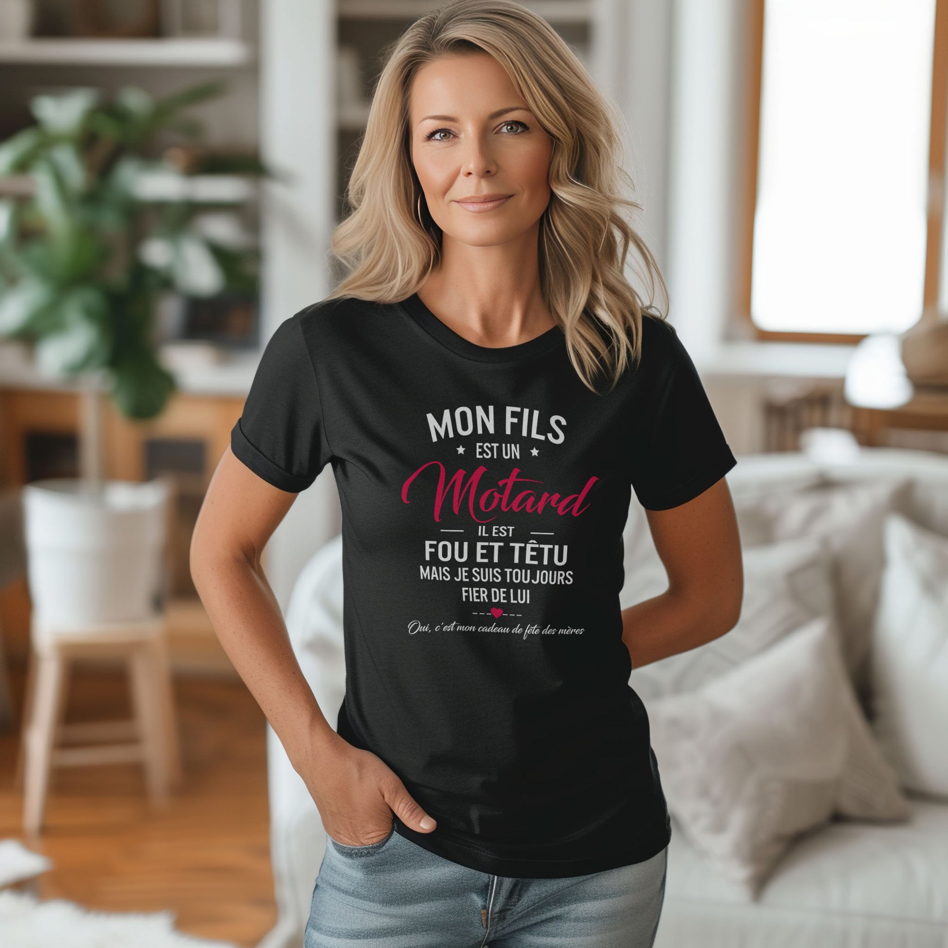 Célébrez le lien spécial entre mère et fils avec ce t-shirt tendance ! Imprimé avec soin, il célèbre la passion de votre fils pour la moto. Portez-le avec fierté et montrez au monde entier votre soutien inébranlable. Un cadeau parfait pour la fête des mères, déclarant avec amour : 'Mon fils est motard et je suis fier de lui.' Exprimez votre admiration pour son courage et son esprit d'aventure à chaque instant
