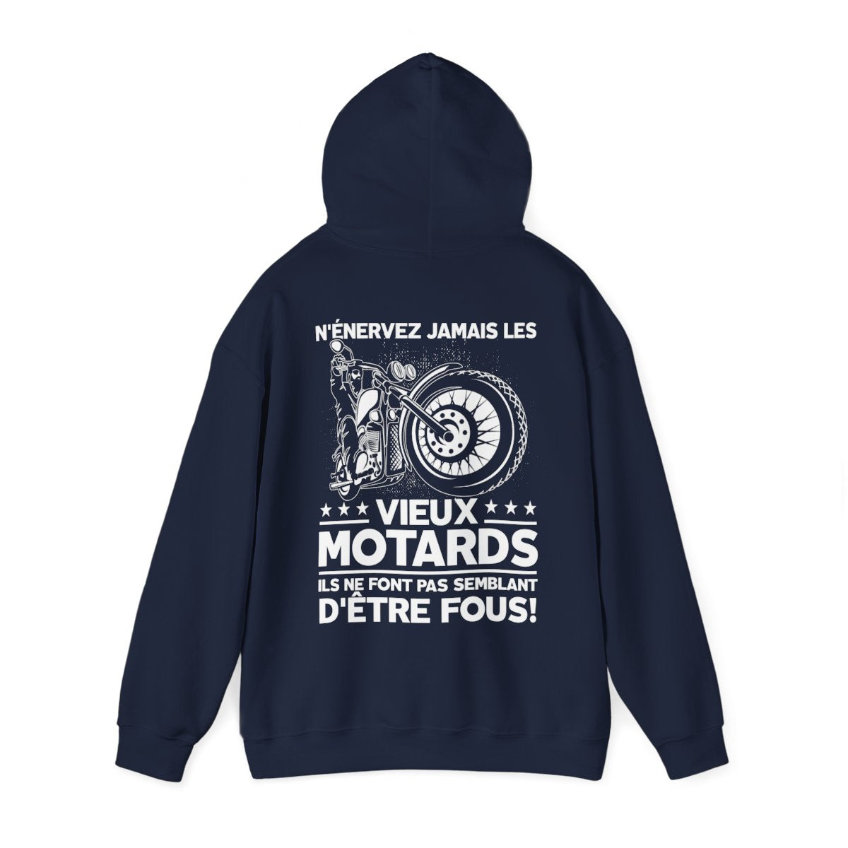 Nos vêtements sont fabriqués avec des matériaux de haute qualité, assurant confort et durabilité, même lors des longues balades sous le soleil ou à travers le vent frais. Le slogan "N'énervez jamais les vieux motards il ne font pas semblant d'être fous" est fièrement affiché, capturant l'essence de votre passion. Que vous soyez au guidon de votre moto ou que vous partagiez un moment entre amis, notre collection vous accompagne dans chaque aventure, symbolisant votre amour pour la liberté et l'aventure sur deux roues.