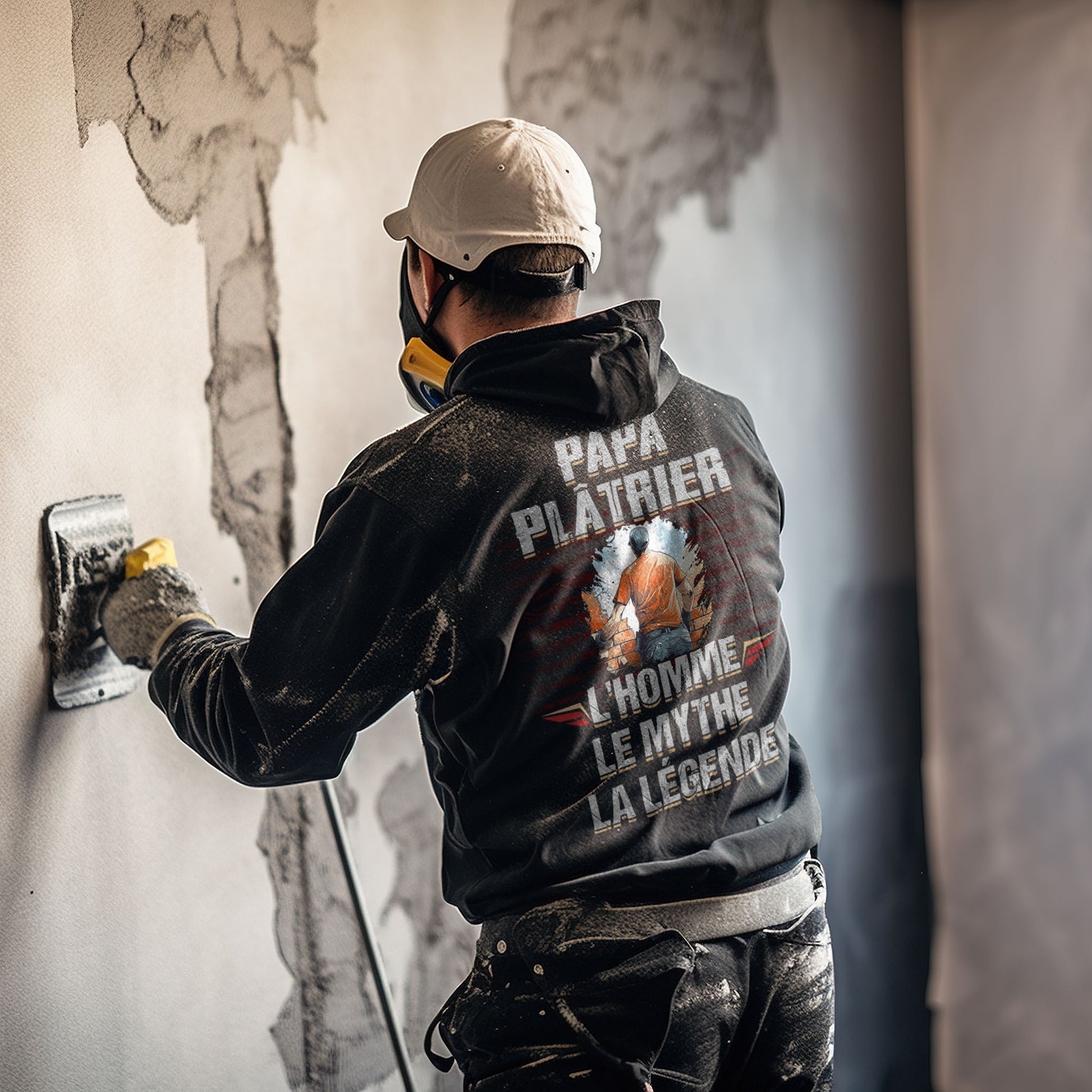 Ce t-shirt arbore le message audacieux "Papa Plâtrier, l'homme, le mythe, la légende.", parfait pour tout plâtrier passionné par son métier. Que vous enduisiez des murs, des plafonds ou d'autres surfaces, ce t-shirt est le moyen parfait d'exprimer votre fierté d'être plâtrier.