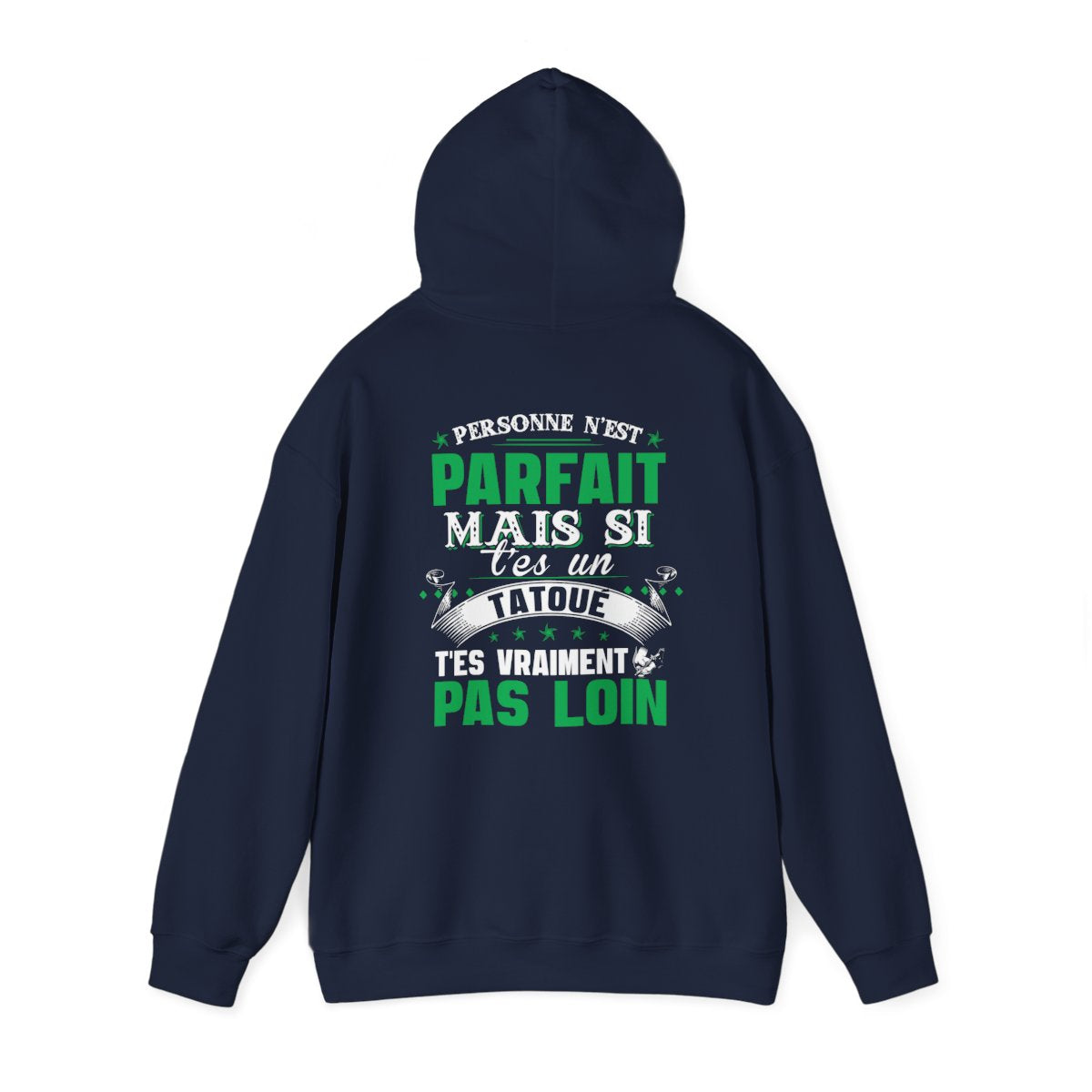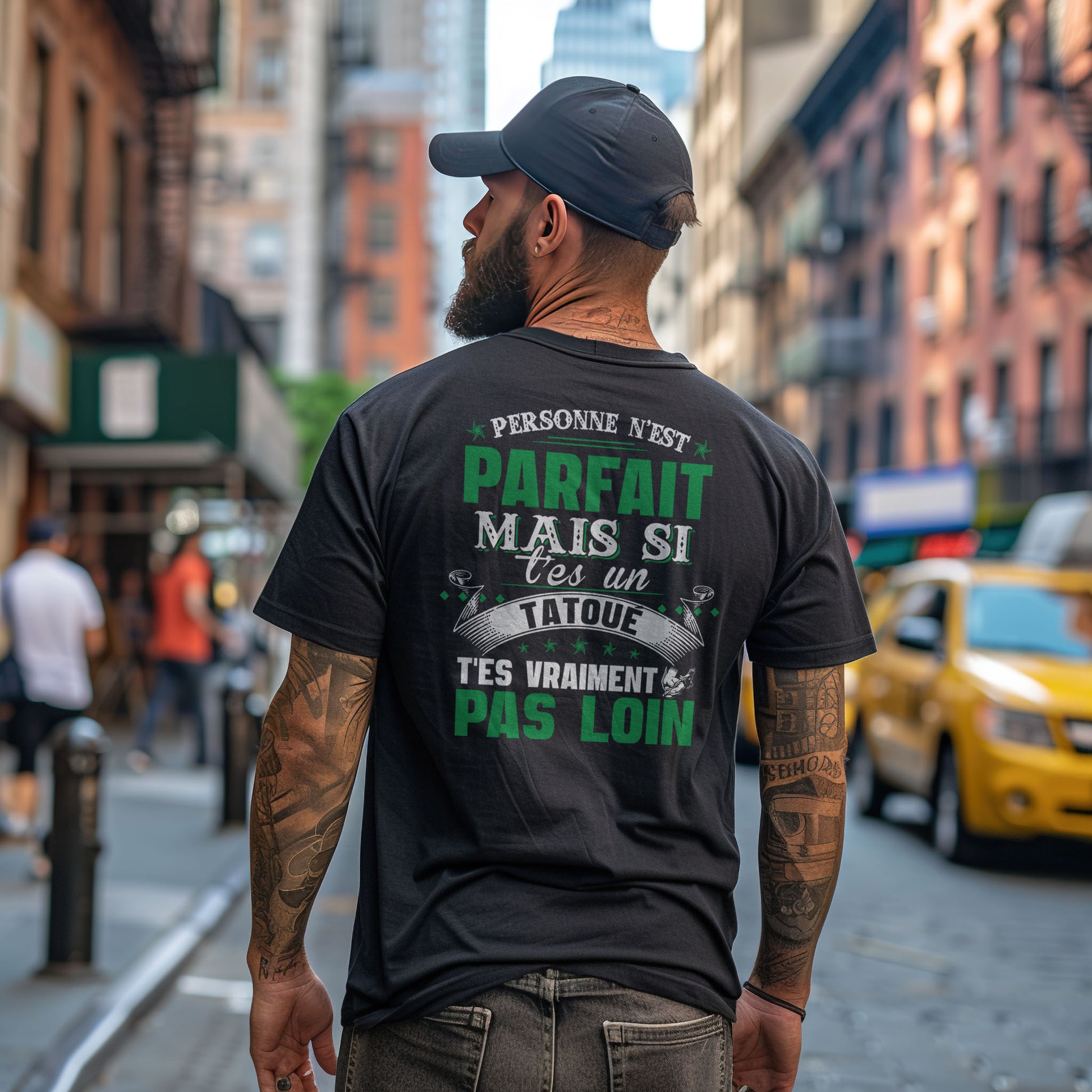 Exprimez votre fierté avec notre T-shirt et hoodie exclusifs. Imprimé avec le message audacieux "Personne n'est parfait mais si t'es un tatoué t'es vraiment pas loin", chaque pièce célèbre votre individualité. Fabriqués avec soin pour un confort optimal, nos vêtements sont parfaits pour les hommes tatoués qui affirment leur style avec assurance.