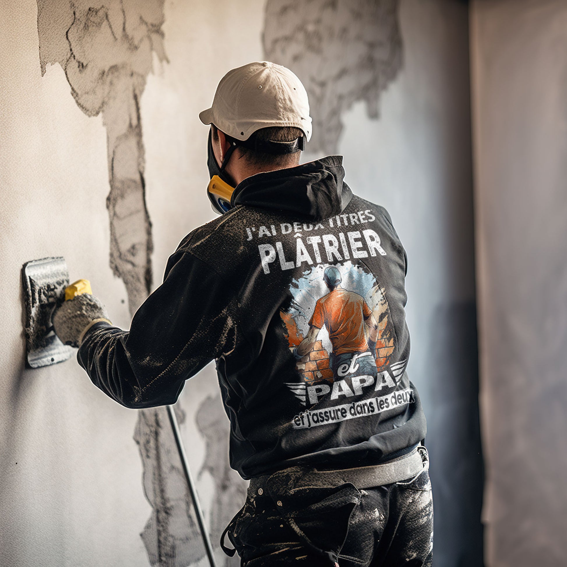 Ce t-shirt arbore le message audacieux "J'ai deux titres : Plâtrier et papa, et j'assure dans les deux.", parfait pour tout plâtrier passionné par son métier. Que vous enduisiez des murs, des plafonds ou d'autres surfaces, ce t-shirt est le moyen parfait d'exprimer votre fierté d'être plâtrier.