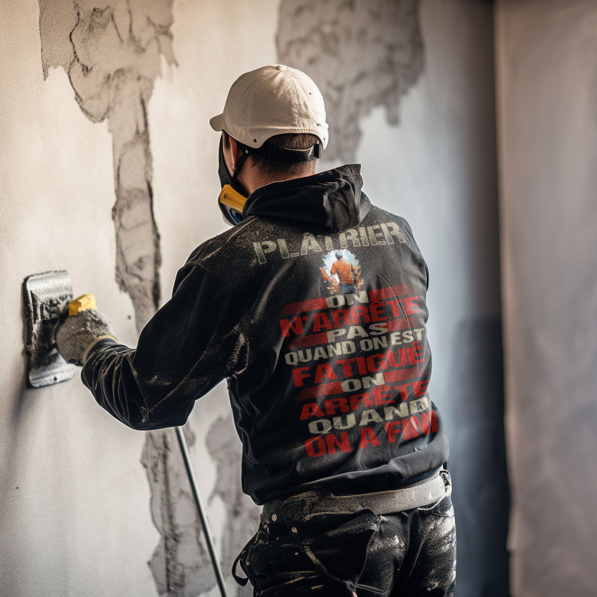 Ce t-shirt arbore le message audacieux "Plâtrier, on n'arrête pas quand on est fatigué, on arrête quand on a fini.", parfait pour tout plâtrier passionné par son métier. Que vous enduisiez des murs, des plafonds ou d'autres surfaces, ce t-shirt est le moyen parfait d'exprimer votre fierté d'être plâtrier.