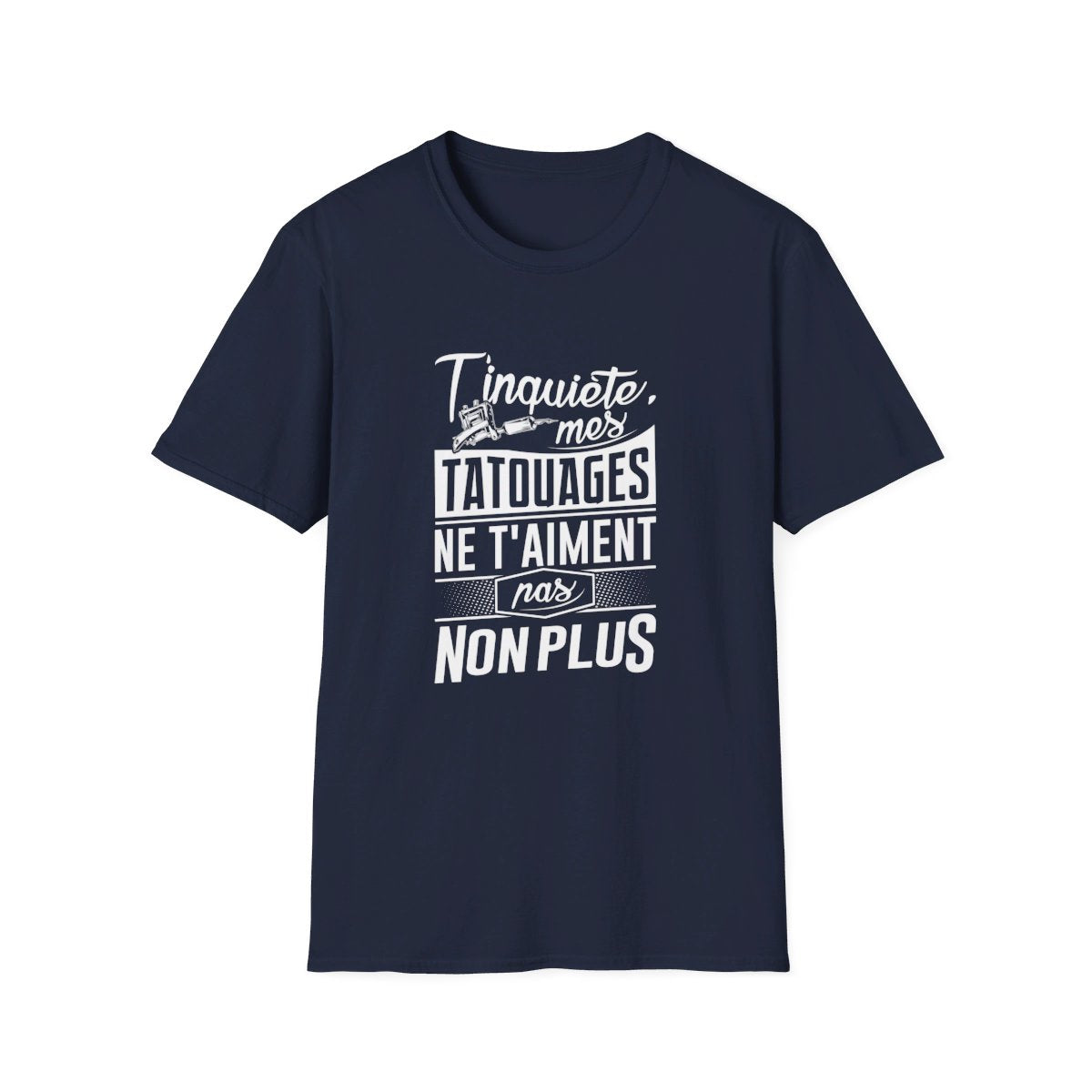 Exprimez votre style unique avec ce t-shirt pour hommes spécialement conçu pour les amateurs de tatouages. Arborant un design audacieux qui met en valeur l'art corporel, ce t-shirt est le choix parfait pour ceux qui vivent et respirent la culture du tatouage. Fait d'un coton doux et respirant, il assure un confort optimal tout au long de la journée. Que vous soyez un passionné de tatouages ou que vous souhaitiez simplement afficher votre côté rebelle, ce t-shirt est un incontournable. T'inquiète, mes tatouages ne t'aiment pas non plus