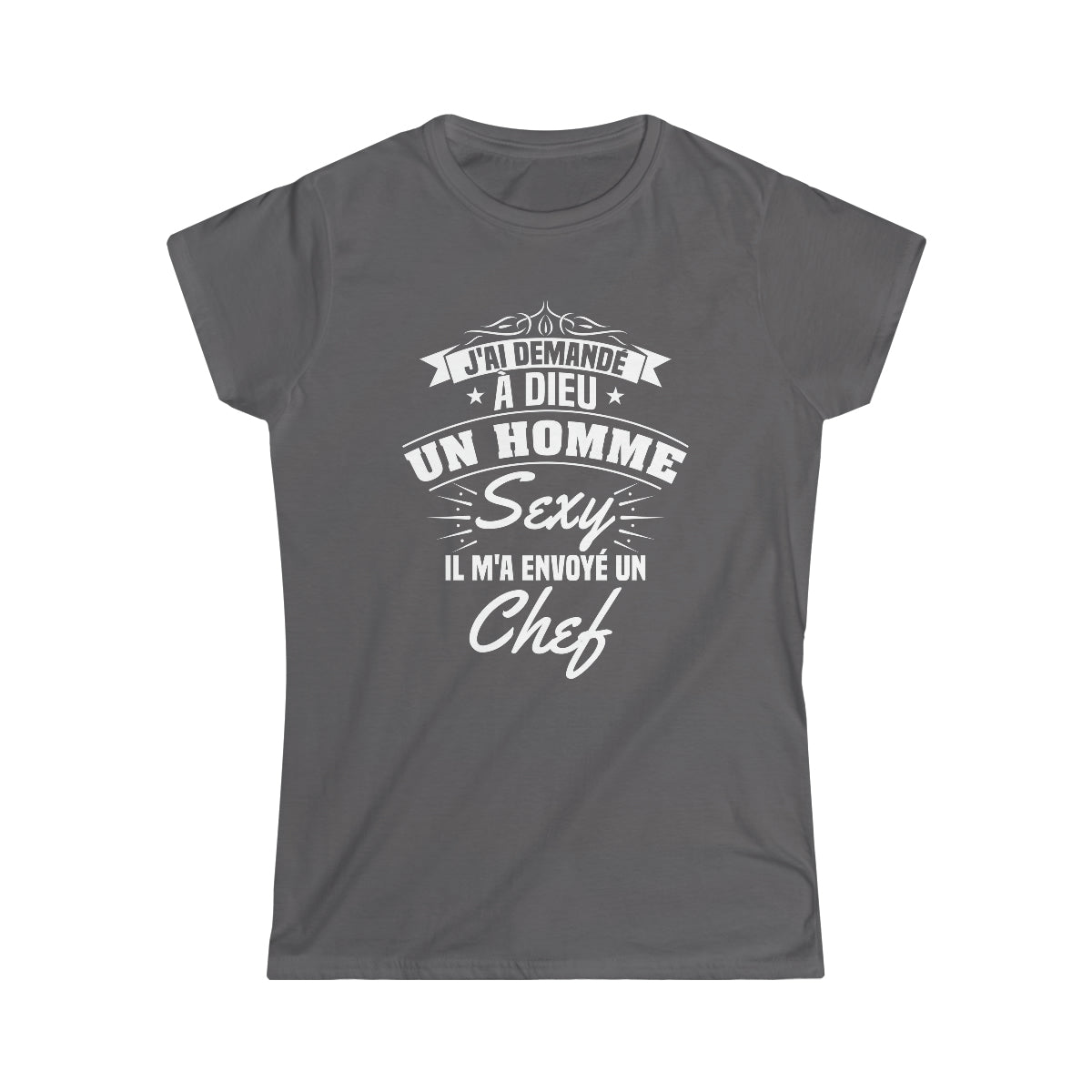 Découvrez notre t-shirt et sweat à capuche spécialement conçu pour les femmes de chefs cuisiniers, célébrant l'art culinaire et la passion qui animent ces maîtres de la cuisine. Affichant fièrement le message "J'ai demandé à dieu un homme sexy il m'a envoyé un Chef", ce vêtement rend hommage à celles qui partagent et soutiennent l'amour de la gastronomie de leur partenaire.